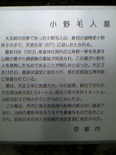 下りてきてからもう一度石碑を見てみたら、「小野毛人朝臣之墓 山上140M」って書いてあって、石碑の横には貸し出し用の杖が数本用意されてました。借りときゃよかった(@_@;)。